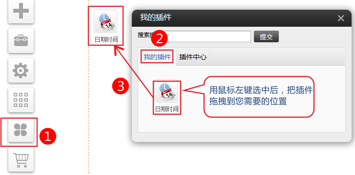 PC和手機版(適用版本基礎(chǔ)版、標準版、營銷版) 1、依次點擊插件-我的插件-選中“日期時間”插件拖拽到您需要的位置。(如果“我的插件”中沒有,請到插件中心選啟用) 2、點擊設(shè)置選擇需要的展示的樣式。 3、您也可以自定義展示樣式。 各符號的意義 年(YY=14YYYY=2014)月(MM=03MMMM=3月)日(Do=1日DD=01)星期(dd=一dddd=星期一) h=小時m=分鐘s=秒a=上午或下午 h=12小時H=24小時 hh,mm,ss=零起始h,m,s=非零起始 []=符號內(nèi)輸入文字會直接顯示 4、設(shè)置后效果如下圖 5、