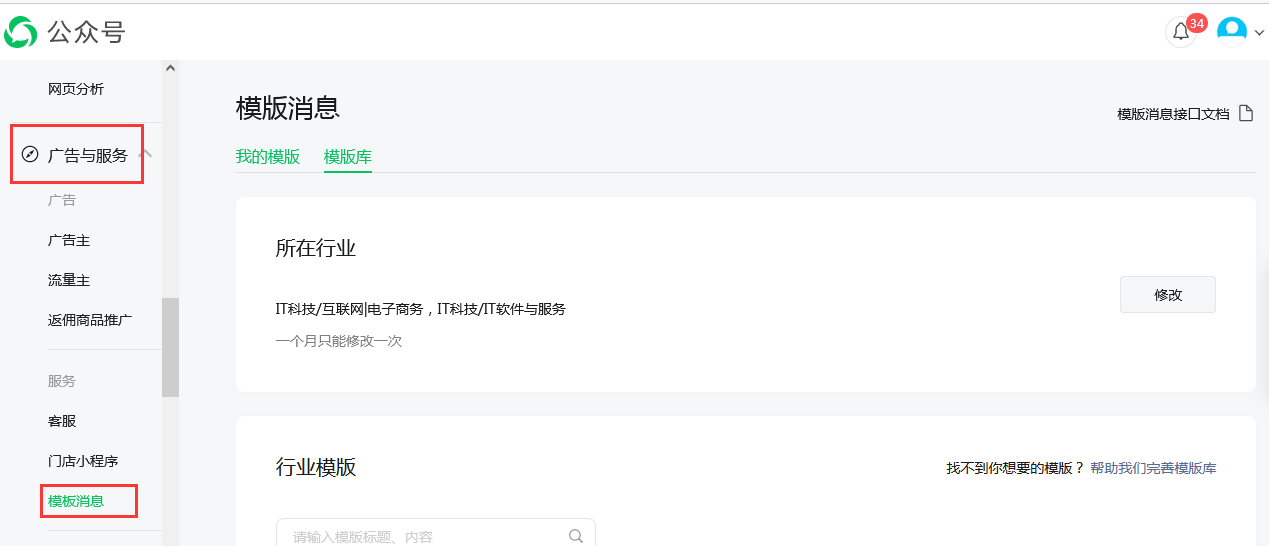 注意:僅營銷版及以版本支持網(wǎng)站用戶綁定微信后,可以使用微信接收訂單提醒信息或找回密碼驗證碼!此功能必須是認證后的服務(wù)號才能使用!流程:1、微信官方后臺模板消息中模板添加2、后臺微信模板設(shè)置中編輯、并開啟3、在公眾賬號中引導用戶綁定賬戶4、后臺中可以查看發(fā)送記錄1、登陸微信官方后臺在廣告與服務(wù)中找到模板消息在微信官方后臺,先申請模板消息模塊,然后模板庫中有各式各樣模板,開啟對應的模板,獲得模板ID!申請模板消息 從模板庫中選擇模板注意選擇It科技/互聯(lián)網(wǎng)|電子商務(wù)、it科技/軟件與服務(wù)行業(yè)| 2:在網(wǎng)站后臺微信模