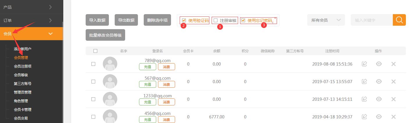 依次點擊會員->會員管理,可以看到網(wǎng)店內(nèi)注冊的所有會員。如圖所示:1.注冊審核開啟后新注冊的用戶都需要管理員審核后才能登陸網(wǎng)站。2.使用驗證碼勾選后在前臺登陸和注冊時都需要輸入驗證碼。如果啟用了該項,則客戶在登錄的時候,會需要輸入顯示在登錄窗口的驗證碼:開啟后在注冊時也需要輸入驗證碼。3.開啟使用忘記密碼,用戶可以在前臺使用找回密碼功能。需要注意的是,如果是電腦端,還需要在模塊的樣式設(shè)置里面勾選顯示4.可以通過會員卡、名字、登陸名,搜索用戶。5.通過微信自動登陸生成的會員在可以在會員管理=》帳戶設(shè)置中設(shè)置