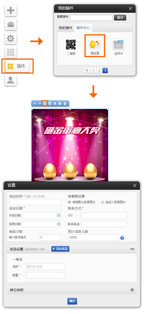 手機版插件適用版本(基礎(chǔ)版、標準版、營銷版)砸金蛋插件(僅手機版本支持)使用方法:進入網(wǎng)站編輯-〉點左側(cè)插件圖標-〉插件中心,找到砸金蛋圖標,點啟用可以使用此插件進行營銷推廣,增加用戶粘性。在微信自定義菜單或關(guān)鍵詞回復里可以設(shè)置鏈接到含有砸金蛋插件的手機頁面,實現(xiàn)微信營銷活動。中獎概率=某個獎項數(shù)量/max(每個賬號每天抽獎次數(shù)*所有獎項數(shù)量之和或每個賬號每天抽獎次數(shù)*活躍人數(shù))注:公式中的分母取A和B2者最大值A(chǔ)每個賬號每天抽獎次數(shù)*活躍人數(shù)B每個賬號每天抽獎次數(shù)*所有獎項數(shù)量之和中獎信息請在后臺管理-》營銷活