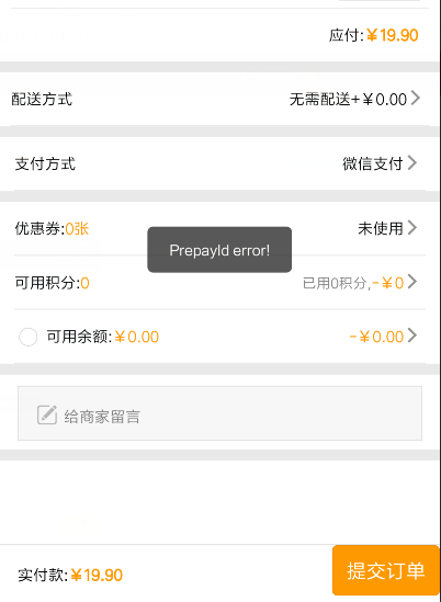 小程序在提交訂單支付時提示prepayiderror報錯信息如下先在商戶平臺查看是否開啟jsapi支付,如果沒開啟先開啟。然后測試支付,如果還不行主要檢查三個地方一.檢查商戶平臺有沒有授權(quán)當前小程序先登陸https://pay.weixin.qq.com然后點擊產(chǎn)品中心-》Appid帳號管理如果列表中沒有您的小程序名稱就點擊關(guān)聯(lián)AppID如果有則跳過此步驟填寫小程序的AppID然后勾選我已閱讀同意再點擊提交附:小程序AppID獲取步驟打開https://mp.weixin.qq.com注意必須用小程序帳號登陸然后點擊開發(fā)-》開發(fā)管理-》開發(fā)設(shè)置獲取到AppID小程序:前往公眾平