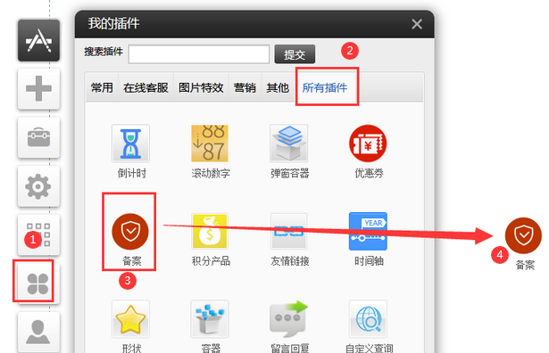 可用版本:基礎(chǔ)版,標(biāo)準(zhǔn)版,營銷版①.備案插件,常用或者所有插件里面可以看到②.拖出備案插件到編輯區(qū)域,選擇備案類型③點擊樣式設(shè)置,可以輸入備案號相關(guān)信息,并且可以設(shè)置文字的樣式,包括懸停樣式④.備案插件已經(jīng)鏈接到信息產(chǎn)業(yè)部備案管理系統(tǒng)網(wǎng)址,用戶只需要填寫備案號信息即可,方便客戶操作手機版用法同上,不再贅述如果要放置在頁腳,點擊屬性勾選為頁腳元素然后拖拽到頁腳保存即可。以上工信部備案流程已經(jīng)完成。如果要添加的備案是公安備案類型請參考以下步驟。選擇公安備案類型填公安備案號和對應(yīng)鏈接。保存即可2分鐘添加