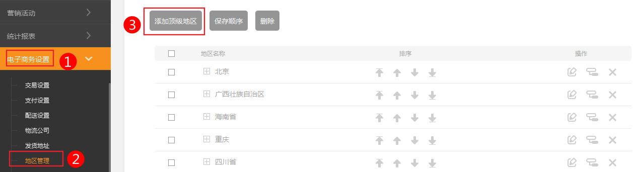 如果系統(tǒng)內(nèi)置的地區(qū)不能滿足您的需求,也可以根據(jù)具體情況進行自定義,如送貨范圍限制為國外城市、或本城市的某些小區(qū)等。本小節(jié)共包含4點。1、通過本部分的操作,您可以輕松實現(xiàn)地區(qū)的自定義,讓商店實現(xiàn)本地化。添加自定義地區(qū)設(shè)置專用配送方式例如:某個商店主要的顧客是本街道范圍內(nèi)的某些小區(qū),針對這種情況單獨設(shè)置一個配送方式。2、添加自定義地區(qū)1.依次點擊電子商務(wù)管理-地區(qū)管理點擊添加頂級地區(qū)點擊添加頂級地區(qū)保存后,在列表中點擊添加二級地區(qū)重復(fù)上述操作,最終小區(qū)詳細(xì)列表:顧客注冊會員后,登陸會員中心,點擊用戶中心頁