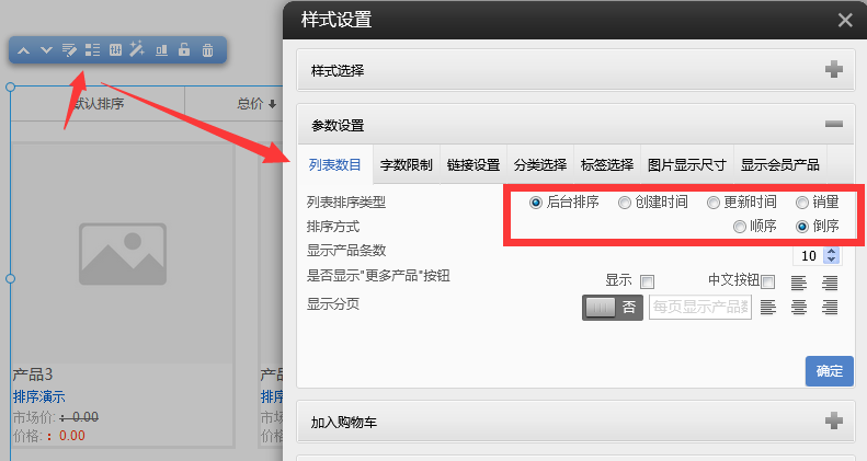 在樣式設(shè)置-》列表數(shù)目可以設(shè)置列表排序類型注意:默認(rèn)排序為后臺排序-》排序方式為倒序即:數(shù)值大的顯示在前面。產(chǎn)品和文章的排序類似,此處用產(chǎn)品列表模塊演示在后臺產(chǎn)品管理-》修改產(chǎn)品順序值-》注意修改完成后需要點擊“保存順序”(系統(tǒng)默認(rèn)排序為:數(shù)值大的顯示在最前面)