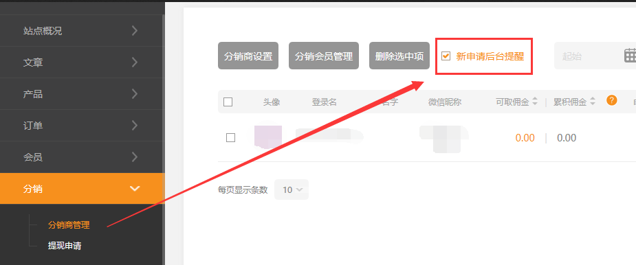 新申請后臺提醒在建站后臺,“分銷”-“分銷商管理”頁面新增了“新申請后臺提醒”的設(shè)置項,勾選后新的分銷商提醒即在右上角的提醒消息中顯示,如圖所示:分銷商管理分銷商傭金明細(xì)下級會員明細(xì)下級分銷商明細(xì)分銷會員管理依次點擊分銷-》分銷商管理-》分銷會員管理可以查詢會員屬于那些分銷商。項目pc手機微信公眾號app端營銷版小程序分銷店鋪不支持不支持支持不支持支持分銷功能支持支持支持支付,但僅支持詳情復(fù)制鏈接支持分銷店鋪滾動條是否支持取消無無不支持無不支持分銷中心店鋪設(shè)置中的圖片能不能修改不能不能不能不能不能廣告語