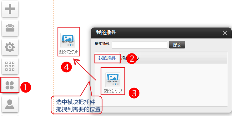 PC版圖文幻燈片插件適用版本(基礎(chǔ)版、標(biāo)準(zhǔn)版、營銷版)新增9種圖片切換效果供客戶選擇,為您的網(wǎng)站呈現(xiàn)更酷更炫的效果。一、使用方法:進入網(wǎng)站編輯-〉點左側(cè)插件圖標(biāo)-〉插件中心,找到圖文幻燈插件圖標(biāo),點啟用然后在我的插件-》選中插件-》拖拽到您需要的位置。二、點擊設(shè)置,添加需要的圖片、設(shè)置超鏈接、標(biāo)題、描述等。三、進行全局設(shè)置
