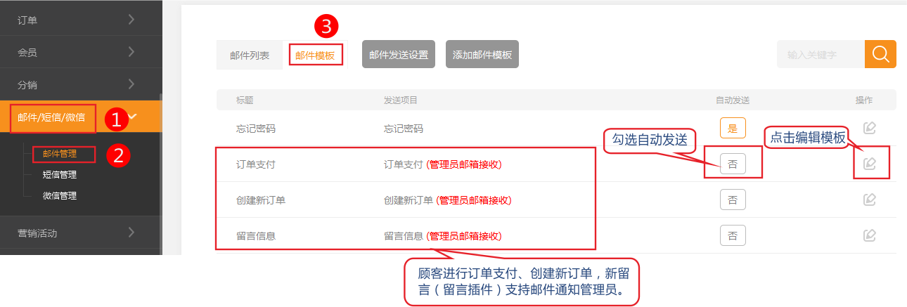 模板的選擇與編輯 為方便用戶的使用,系統(tǒng)內(nèi)置了常用的電子郵件。店主只需簡單編輯,就可以直接使用。 例如:某店主想在用戶注冊成功后,通過郵件用戶,并告知用戶名及密碼。 勾選“會員注冊時”自動發(fā)送,啟用模板,如圖所示 如編輯郵件的注冊模板 注意:模板必須勾選自動發(fā)送后才會起作用,如果某個功能沒有生效,請確認(rèn)是否已經(jīng)勾選!