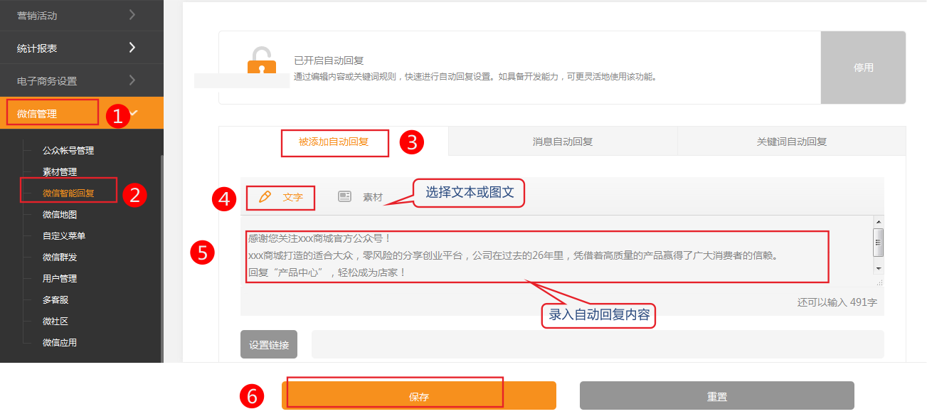 在微信公眾平臺設(shè)置被添加自動回復(fù)后,粉絲在關(guān)注您的公眾號時,會自動發(fā)送您設(shè)置的文字/圖片給粉絲。設(shè)置方法:通過在微信管理=》微信智能回復(fù)=》被添加自動回復(fù),可設(shè)置的文字/圖片被添加自動回復(fù)內(nèi)容。手機微信中效果:注意:被添加自動回復(fù)只能設(shè)置一條。圖片支持JPG、PNG格式,較好的效果為大圖360*200,小圖200*200
