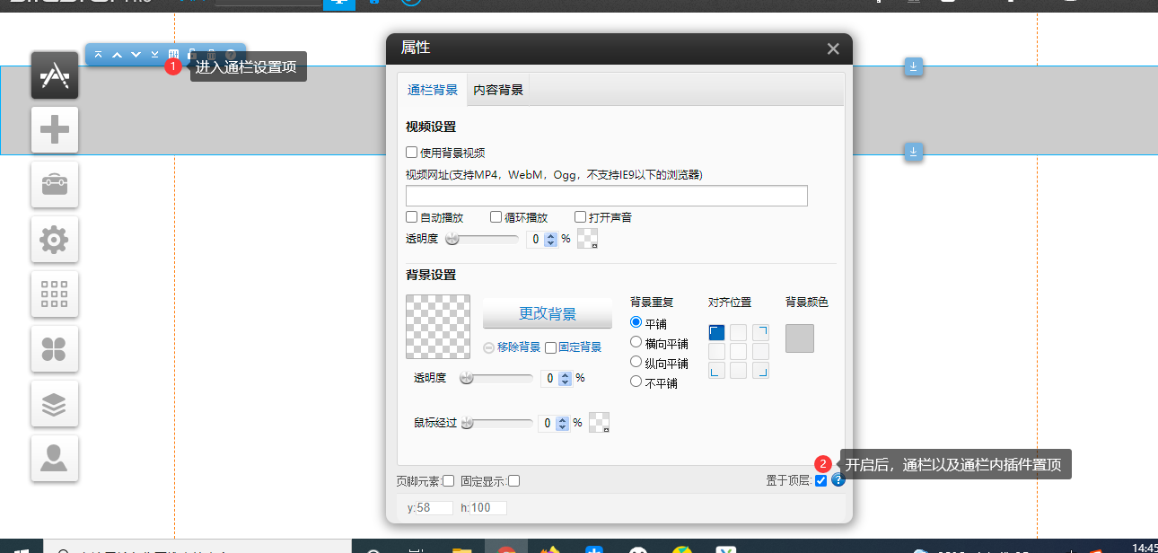 該功能可提高用戶網(wǎng)站編輯的效率,1.在編輯器環(huán)境下-》添加-》通欄-》屬性-》開啟置于頂層開啟后,通欄與通欄內(nèi)插件層級均高于頁面其它插件(個別插件除外,下文會描述)。例如:把導(dǎo)航放入通欄內(nèi),則導(dǎo)航與通欄在瀏覽環(huán)境,導(dǎo)航層級最高,通欄第二,其它插件根據(jù)層級高低依次顯示。2.特殊插件(通欄開啟置于頂層,層級依舊高于通欄)1.浮動客服,在線客服2.側(cè)邊欄3.高級代碼(一些浮動插件,層級可能高于通欄)