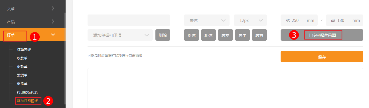 店主可以自己編輯、建立模板。本小節(jié)共包含2點。1、通過本部分的操作,您會對快遞單模板有深入的了解!添加新快遞單模板編輯快遞單模板一、添加新快遞單模板1.依次點擊訂單-》添加打印模板-》錄入單據(jù)名稱-》上傳單據(jù)的圖片會提示先上傳新單據(jù)的圖片圖片最好用分辨率高的掃描儀進行處理,效果會更好。分辨率建議在96dpi左右圖片上傳結(jié)束后,根據(jù)圖片中內(nèi)容項位置添加相應(yīng)打印項就可以。2、編輯快遞單模板如果對快遞單模板的內(nèi)容不滿意,可以隨時進行調(diào)整在相應(yīng)快遞單模板上點擊編輯會彈出訂單的編輯界面其中背景圖可以隨時更換!發(fā)貨信息及