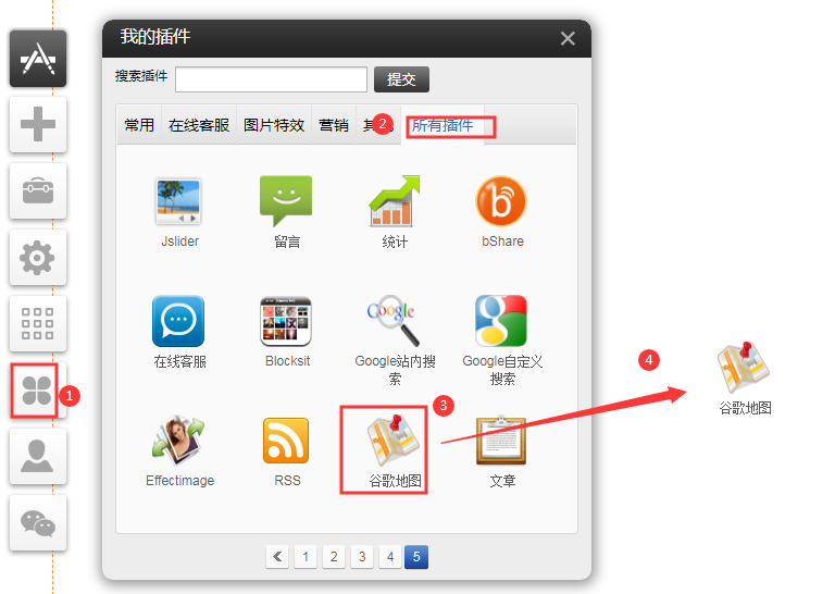 1、從左側(cè)的工具欄,單擊“插件”圖標(biāo)打開“我的插件,在“所有插件”界面選中Google地圖插件后按住左鍵不放,然后把Google地圖插件拖拽到您需要的位置。注意:Google地圖大陸地區(qū)加載在不了,建議使用百度地圖插件。2、錄入英文地址3、在編輯界面,右上角保存。顯示結(jié)果如下,和本地使用的瀏覽器語言有關(guān)系,海外地址如果是英文瀏覽器顯示的是全英文,如果是中文瀏覽器顯示的是中文和英文一起顯示。大陸地址如果是是英文瀏覽器顯示的顯示的是中文和英文,如果是海外地址顯示的是全英文