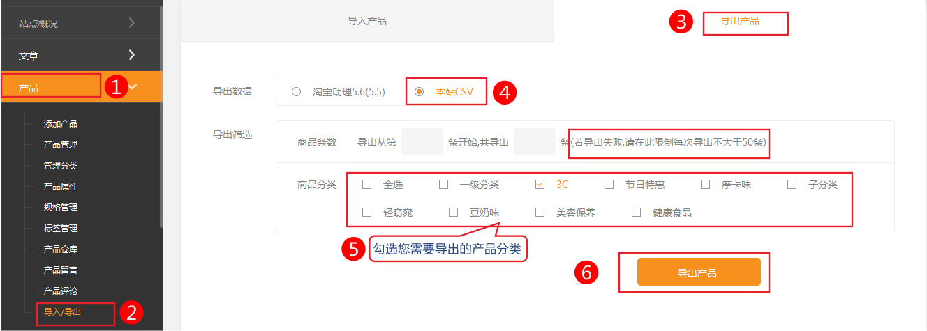 本小節(jié)共包含5點(diǎn)。1、通過本部分的操作,您可以快速對(duì)某部分商品進(jìn)行簡單的批量操作。選擇所需要編輯的商品,然后用CSV文件方式導(dǎo)出根據(jù)自己需要對(duì)其中商品進(jìn)行編輯,然后保存上傳編輯后的CSV文件即可注意:CSV文件可以通過Excel等軟件打開和編輯。(注意csv分隔符選擇制表符.)例如,網(wǎng)站有多個(gè)分類的商品,3C分類下的部分商品需要調(diào)整價(jià)格2、選擇商品,導(dǎo)出CSV文件依次點(diǎn)擊后臺(tái)管理-產(chǎn)品管理-導(dǎo)入/導(dǎo)出-》導(dǎo)出-》本站csv,選擇需要編輯的商品分類3C,點(diǎn)擊導(dǎo)出,選擇CSV文件并下載3、用Excel編輯下載的CSV文件,可以
