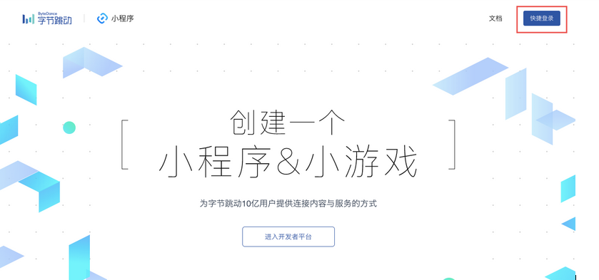 注意:僅營銷版(及以上版本)支持字節(jié)小程序暫時(shí)不支持在線銷售功能,沒有支付功能一.注冊賬號(hào)注冊并登陸在開發(fā)者平臺(tái)https://developer.toutiao.com/中點(diǎn)擊右上角的「快捷登錄」進(jìn)行帳號(hào)注冊。申請小程序注冊帳號(hào)成功后,系統(tǒng)會(huì)自動(dòng)提示進(jìn)行小程序申請。點(diǎn)擊自動(dòng)彈出的「申請」按鈕,即可進(jìn)入小程序申請頁面。(若此次未申請,之后可通過頁面中的「進(jìn)入開發(fā)者平臺(tái)」進(jìn)入) 在該頁面的「選擇類型」條目下選擇「小程序」類型,后續(xù)內(nèi)容根據(jù)具體情況各自補(bǔ)充。小程序申請發(fā)出后,字節(jié)小程序?qū)⒃趦蓚€(gè)工作日內(nèi)通過您注冊時(shí)的手機(jī)號(hào)以及
