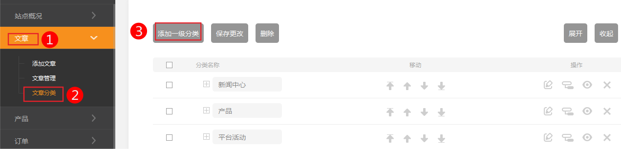 本小節(jié)共包含5點(diǎn)。1、看完本節(jié)內(nèi)容您應(yīng)該知道: 添加文章分類(lèi)往往是第一步的,一個(gè)文章必須添加在一個(gè)分類(lèi)下 添加分類(lèi)以后,您可以對(duì)分類(lèi)的順序進(jìn)行調(diào)整,讓您認(rèn)為重要的分類(lèi)顯示在前面。 添加分類(lèi)以后,您可以通過(guò)編輯這個(gè)分類(lèi)來(lái)調(diào)整這個(gè)分類(lèi)的層級(jí)關(guān)系 2、添加分類(lèi) 1.依次點(diǎn)擊后臺(tái)管理-文章-文章分類(lèi) 2.錄入頂級(jí)分類(lèi)名稱,如果需要在頂級(jí)分類(lèi)下添加子分類(lèi),直接點(diǎn)擊添加子分類(lèi)即可。 如果還有添加頂級(jí)分類(lèi)點(diǎn)擊添加一級(jí)分類(lèi)即可 添加完完畢以后點(diǎn)擊保存更改,可以在分類(lèi)列表中看到它 3、調(diào)整分類(lèi)的顯示順序 可能