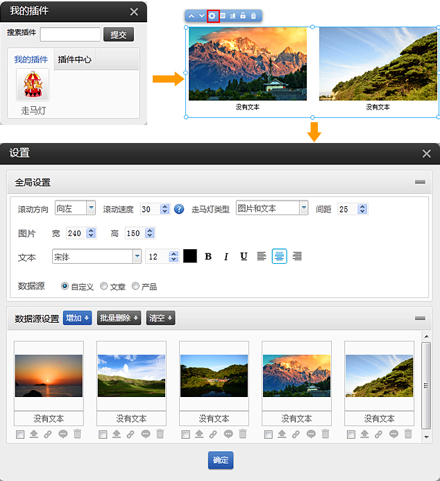 PC和手機(jī)版插件(適用版本基礎(chǔ)版、標(biāo)準(zhǔn)版、營(yíng)銷(xiāo)版)使用方法:進(jìn)入網(wǎng)站編輯-〉點(diǎn)左側(cè)插件圖標(biāo)-〉插件中心,找到走馬燈插件圖標(biāo),點(diǎn)啟用以下是操作流程圖1、依次點(diǎn)擊插件-我的插件-用鼠標(biāo)左鍵選中走馬燈插件并拖拽到您需要的位置。如果插件沒(méi)有在“我的插件”中,請(qǐng)先到“插件中心”將插件啟用。啟用后在“我的插件”中,把插件拖到頁(yè)面中應(yīng)用。2、設(shè)置走馬燈的類(lèi)型、方向、速度、樣式及數(shù)據(jù)源1支持走馬燈類(lèi)型有:圖片+文本,僅圖片,僅文本2支持設(shè)置滾動(dòng)方向:向左,向右,向上,向下。還可以自行設(shè)定滾動(dòng)速3支持設(shè)置間距,圖片寬度和高