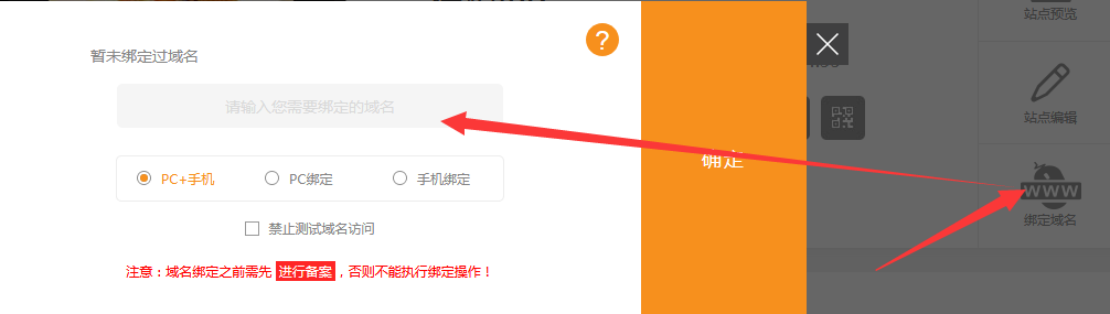 綁定類(lèi)型詳解A綁定PC+手機(jī),訪問(wèn)時(shí)做到自動(dòng)識(shí)別,即:手機(jī)訪問(wèn)就是手機(jī)網(wǎng)站,PC訪問(wèn)就是PC版網(wǎng)站B綁定PC,通過(guò)PC或手機(jī)訪問(wèn)時(shí)均看到PC版網(wǎng)站C綁定手機(jī),通過(guò)PC或手機(jī)訪問(wèn)時(shí)均看到手機(jī)版建站注意綁定域名時(shí)填寫(xiě)您帶www前綴的域名即可如www.qq.com注意:一般綁定域名需要綁定www前綴的域名