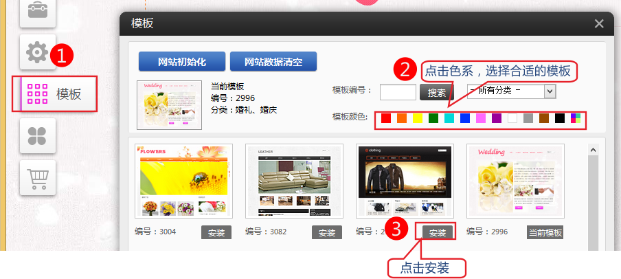 配置網(wǎng)站的第一步是選擇模板。(如果已經(jīng)選擇了合適的模板就跳過(guò)這一步驟)1、點(diǎn)擊編輯頁(yè)面左側(cè)的模版,進(jìn)入模版界面。系統(tǒng)按照不同色系提供多種模板供您選擇,點(diǎn)擊色系,選擇合適的模板,點(diǎn)擊安裝即可如下圖:備注:標(biāo)準(zhǔn)的用戶選擇不了營(yíng)銷(xiāo)的模版。這兩類(lèi)客戶如果點(diǎn)擊了安裝模版后,會(huì)出現(xiàn)相關(guān)的提示。2、填寫(xiě)網(wǎng)站基本信息1.依次點(diǎn)擊設(shè)置-網(wǎng)站設(shè)置“網(wǎng)站設(shè)置”界面如下圖:2.錄入您的站點(diǎn)名稱-保存