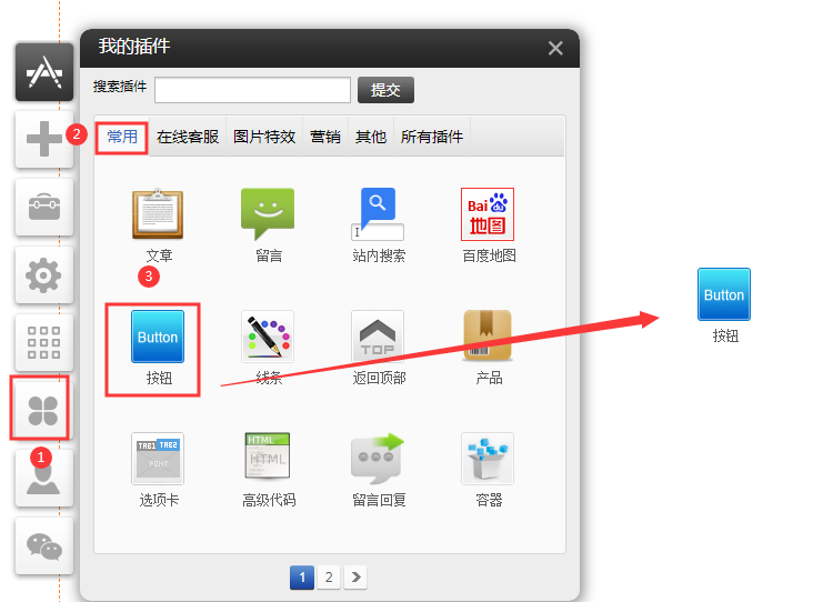PC和手機(jī)版按鈕插件(適用版本基礎(chǔ)版、標(biāo)準(zhǔn)版、營(yíng)銷(xiāo)版)通過(guò)本部分的操作,您可順利為您的網(wǎng)站設(shè)置按鈕插件。系統(tǒng)提供12種按鈕樣式可供選擇支持設(shè)置超級(jí)鏈接支持客戶自定義按鈕顯示樣式:文字,背景,邊框,鼠標(biāo)經(jīng)過(guò)等設(shè)置1、依次點(diǎn)擊插件-常用-選中“按鈕”插件拖拽到您需要的位置。2.點(diǎn)擊設(shè)置可以配置按鈕文本和鏈接,并選擇樣式。設(shè)置鏈接按鈕支持透明的樣式注意選最后一個(gè)樣式將背景設(shè)置為透明即可3、按鈕復(fù)制功能以pc版為例,在編輯器中拖入“按鈕”插件,點(diǎn)擊“復(fù)制”,編輯文本(注:文本字?jǐn)?shù)限100以內(nèi))后點(diǎn)擊保存,前臺(tái)點(diǎn)擊按鈕