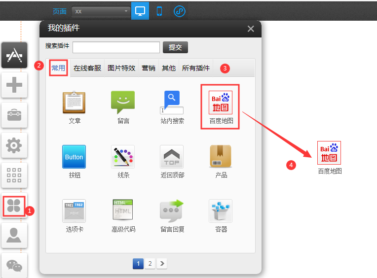 PC和手機(jī)版百度地圖插件(適用版本基礎(chǔ)版、標(biāo)準(zhǔn)版、營(yíng)銷(xiāo)版)1、從左側(cè)的工具欄,單擊插件圖標(biāo),打開(kāi)插件中心,選中百度地圖插件后按住左鍵不放,然后把百度地圖插件拖拽到您需要的位置。2、點(diǎn)擊“設(shè)置”在彈出窗口中點(diǎn)擊“獲取AK”也可以直接開(kāi)https://lbsyun.baidu.com/apiconsole/key?application=key#/home獲取百度地圖訪問(wèn)AK登陸后,點(diǎn)擊創(chuàng)建應(yīng)用注意:應(yīng)用類(lèi)型選“瀏覽器端”,注意勾選“地理編碼”白名單中填*注意:如果Referer沒(méi)填*,也沒(méi)填您自己的域名訪問(wèn)站點(diǎn)時(shí)會(huì)提示:APPReferer校驗(yàn)失敗。請(qǐng)檢查該AK設(shè)置的白名單與