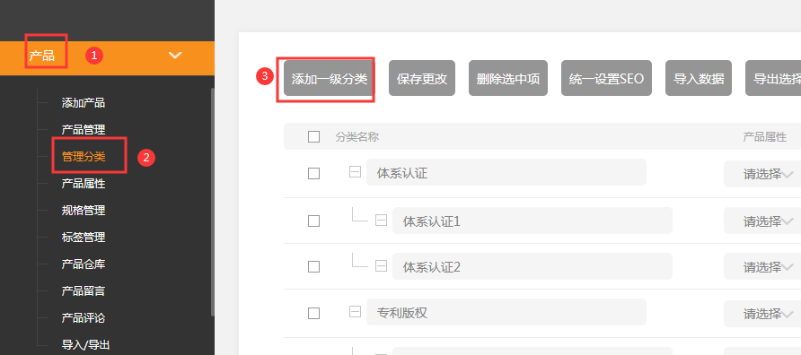 小節(jié)共包含5點(diǎn)。1、看完本節(jié)內(nèi)容您應(yīng)該知道:添加產(chǎn)品分類(lèi)往往是第一步的,一個(gè)商品必須添加在一個(gè)分類(lèi)下添加分類(lèi)以后,您可以對(duì)分類(lèi)的順序進(jìn)行調(diào)整,讓您認(rèn)為重要的分類(lèi)顯示在前面。添加分類(lèi)以后,您可以通過(guò)編輯這個(gè)分類(lèi)來(lái)調(diào)整這個(gè)分類(lèi)的層級(jí)關(guān)系2、添加分類(lèi)1.依次點(diǎn)擊產(chǎn)品->產(chǎn)品分類(lèi)->添加一級(jí)分類(lèi)錄入分類(lèi)名稱,并保存2.如果需要在頂級(jí)分類(lèi)下添加子分類(lèi),直接點(diǎn)擊添加子分類(lèi)即可。如果還有添加頂級(jí)分類(lèi)點(diǎn)擊添加一級(jí)分類(lèi)即可添加完完畢以后點(diǎn)擊保存更改,可以在分類(lèi)列表中看到它添加完完畢以后,可以在分類(lèi)列表中看到它3、調(diào)整分