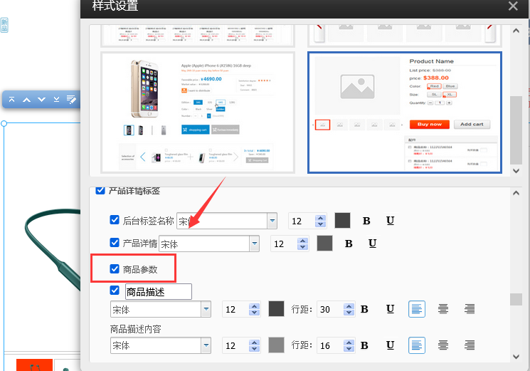 在產(chǎn)品詳情插件中點(diǎn)擊樣式設(shè)置勾選顯示商品參數(shù)顯示位置如圖所示添加參數(shù)位置在后臺-》產(chǎn)品屬性中添加后,在添加產(chǎn)品時設(shè)置對應(yīng)屬性即可