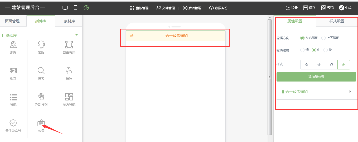 公告插件(小程序全版本)1.在小程序編輯器,現(xiàn)新增公告插件,使用該功能發(fā)布重要消息可使用戶更易發(fā)現(xiàn),用戶也可點(diǎn)擊公告內(nèi)容文字跳轉(zhuǎn)到設(shè)置的對應(yīng)頁面,如下圖所示: