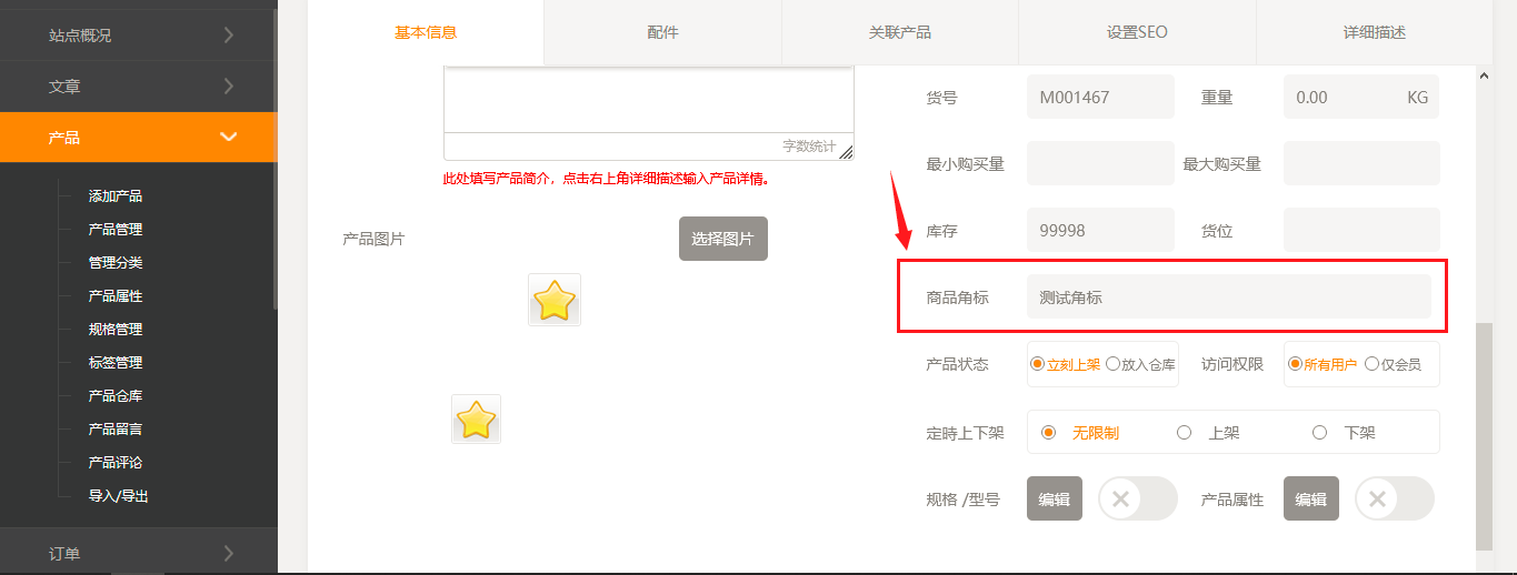1.在建站后臺,“產(chǎn)品”-“產(chǎn)品管理”中添加或者編輯產(chǎn)品,新增了商品角標(biāo)字段,如圖所示:2.在建站中,拖出“產(chǎn)品列表”插件,在樣式設(shè)置中開啟角標(biāo),即可看到角標(biāo)并設(shè)置樣式。五.新增暢言單點(diǎn)登錄功能(pc手機(jī)全版本)