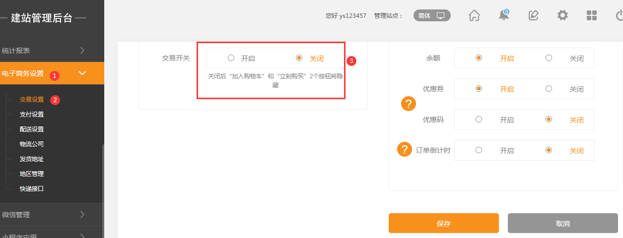 標(biāo)準(zhǔn)版(營銷版)產(chǎn)品詳情中“購物車”為什么不顯示?在“管理后臺”的“電子商務(wù)設(shè)置>交易設(shè)置”中,檢查交易開關(guān)是否開啟,如果交易開關(guān)關(guān)閉則不顯示購物車。如果開啟后還不顯示請?jiān)诰W(wǎng)站后臺點(diǎn)擊“網(wǎng)站編輯”“頁面”-》找到帶產(chǎn)品詳情插件的頁面一般名稱為產(chǎn)品詳情。然后選中產(chǎn)品詳情插件點(diǎn)擊樣式設(shè)置向下拉動找到“加入購物車”和“立即可購買”設(shè)置,勾選后保存即可