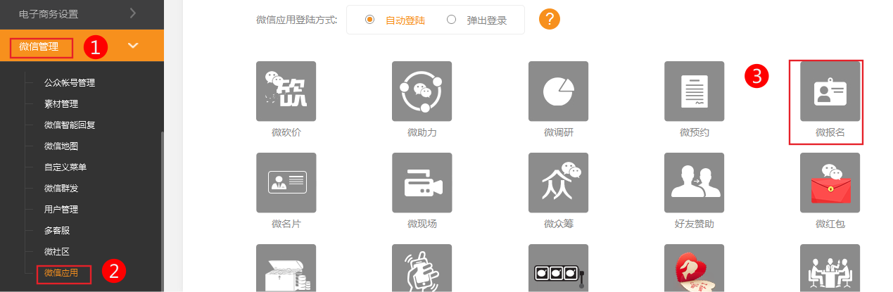 插件微報(bào)名(適用版本手機(jī)營(yíng)銷版)后臺(tái):可以添加多個(gè)報(bào)名活動(dòng),自定義報(bào)名表單內(nèi)容,設(shè)定是否需要會(huì)員登錄,查看報(bào)名參加人員前臺(tái):插件中心,新增微報(bào)名插件可選擇使用哪個(gè)報(bào)名數(shù)據(jù)可設(shè)置報(bào)名界面樣式頁(yè)頭部圖片建議尺寸:320px*160px1、依次點(diǎn)擊微信管理-》微信應(yīng)用-》微報(bào)名2、點(diǎn)擊新增報(bào)名活動(dòng)添加。注意:下拉選項(xiàng)、多選框由|分隔3、點(diǎn)擊參與人員管理參與者的報(bào)名狀態(tài)。4、?從左側(cè)的工具欄插件中,選中微報(bào)名插件后按住左鍵不放,然后把微報(bào)名插件拖拽到您需要的位置。(要使用該插件需要您先在插件中心啟用)?5、選擇數(shù)據(jù)源-》保