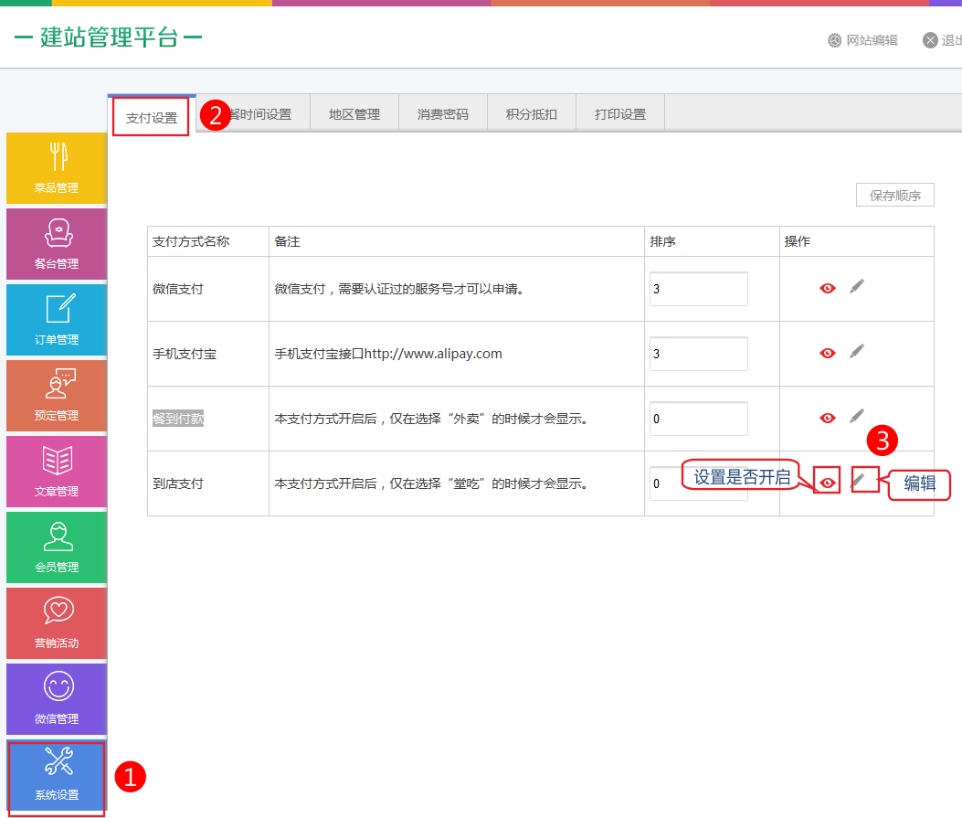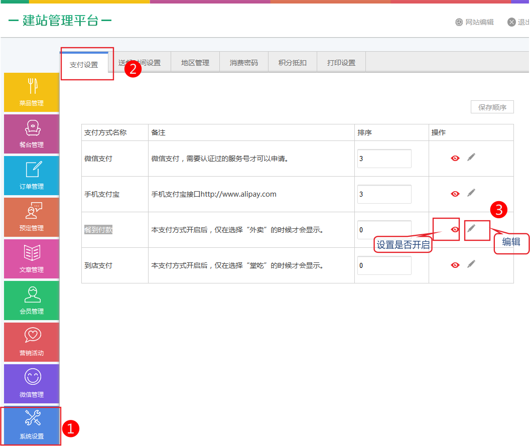 餐到付款用戶在選擇外賣時(shí)才會(huì)顯示此支付接口。 添加方式 依次點(diǎn)擊系統(tǒng)設(shè)置-》支付設(shè)置-》編輯餐到付款。 設(shè)置支付方式名稱然后保存