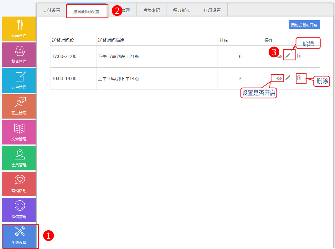 小節(jié)共包含2點(diǎn)。1、通過本部分的操作,您可以添加配送時(shí)間段,關(guān)閉配送時(shí)間段功能 1、添加收貨時(shí)間段。 1.依次點(diǎn)擊系統(tǒng)設(shè)置-》送餐時(shí)間設(shè)置添加您需要的時(shí)間段 2.設(shè)置配送時(shí)間段,錄入您需要的描述 3.添加后自動(dòng)在配送時(shí)間設(shè)置列表中顯示 4,前臺(tái)展示效果。 2、如果不希望前臺(tái)顯示收貨時(shí)間怎么辦。 在操作點(diǎn)擊關(guān)閉所有時(shí)間段即可。