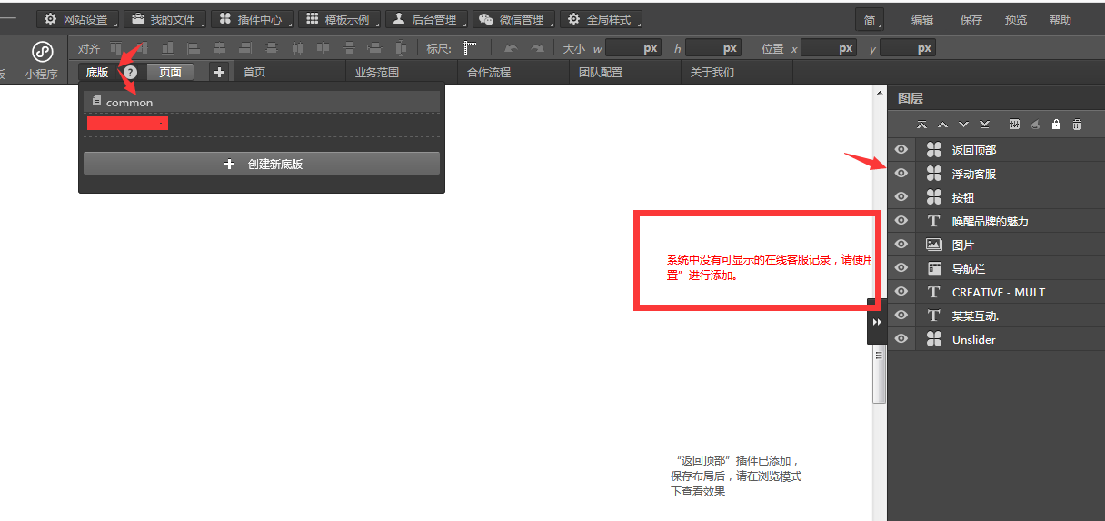 一般找不到模塊可以在底版或頁(yè)腳查看,重點(diǎn)查看底版。先切到底版通過右側(cè)菜單可以快速定位客服插件位置。
